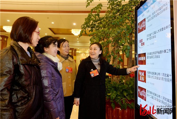 几位省人大代表在驻地浏览河北日报电子阅报屏上的省两会新闻。记者张昊摄