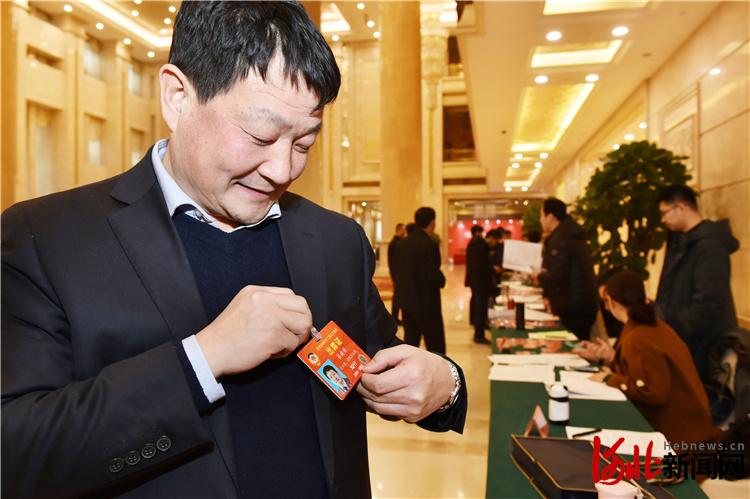 1月5日上午,出席省政协十二届三次会议的崔建升委员报到后,将出席证佩戴在胸前。 记者赵海江摄
