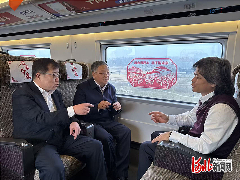 3月3日上午,报到途中,住冀全国政协委员在高铁列车上交流讨论。 赵新宇摄